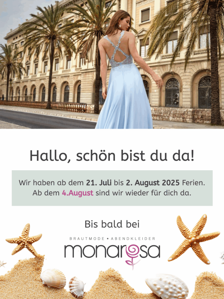 monarosa bietet vom Brautkleid (fast und ganz neu) bis zum Festkleid, von dem passenden Brautschmuck bis zum perfekten Tanzschuh – alles was das Herz höherschlagen lässt. Wir freuen uns, wenn auch Du schon bald auf unserem Sofa mit Prosecco auf dein neues Lieblingskleid anstösst.